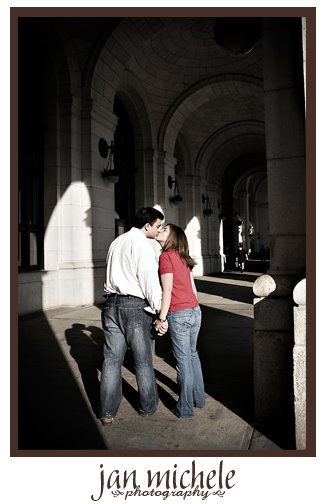 After many attempts, over 3 months, to find a beautiful day for their engagement shoot, Friday was finally the day! Brenna and Jake were troopers as they had quite an audience at Union Station during the evening rush hour. They said they wanted the flavor of DC in their engagement shoot… 🙂 This is one of my favorite shots, requiring me to shoot between the heads of the people rushing by to get to the metro.