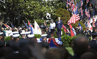 Queen Elizabeth arrived at the White House this morning and I was one of the thousands there for the Arrival Ceremony. Here are a few pictures of the Queen and President Bush both of which made brief remarks. Officials including Condoleeza Rice and the Cheney’s on the far right.